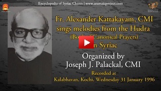 Fr. Alexander Kattakkayam, CMI sings melodies from the Syriac Hudra Here is a music treasure from the past. This is the first of forty-four melodies I recorded in the voice of Fr. Alexander Kattakkayam, CMI, a scholarly singer of Syriac chants. These recordings are significant because they contain melodies that are not currently in use. They are not in use because Fr. Abel Periyappuram, CMI, who prepared the Malayalam version of the Hudra, decided not to use them. Fr. Abel articulated his reason to do so in a letter to me on 15 December 1997....... |