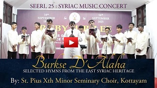 ST PIUS MINOR SEMINARY, KOTTAYAM | Burkse D' Alaha | SYRIAC MUSIC CONCERT Presented by the 1st & 2nd Year Seminarians of the Missionary Society of St. Pius Xth Minor Seminary, Kottayam. Performed during the SEERI 2K25 - SYRIAC MUSIC CONCERT, organized by St. Ephrem Research Institute (SEERI), Kottayam...... |