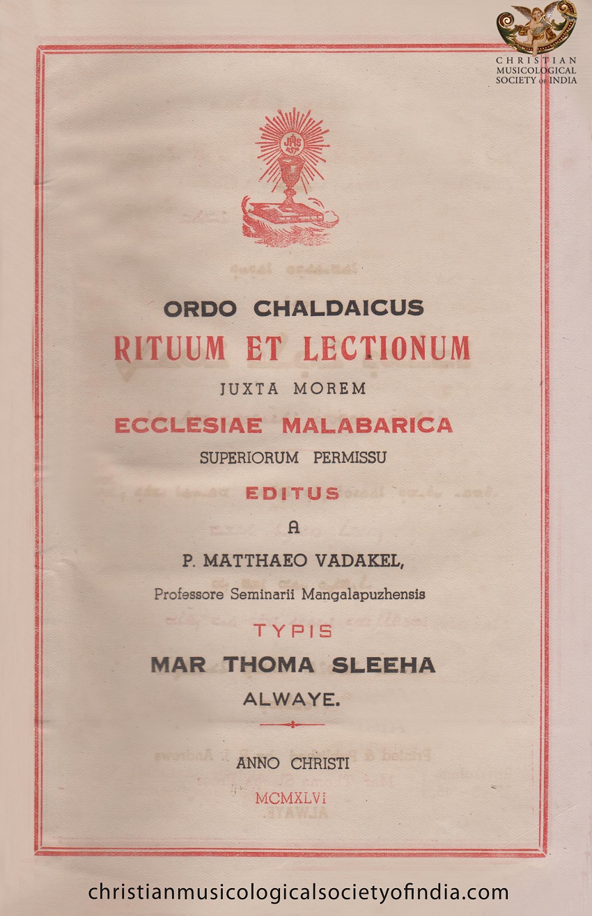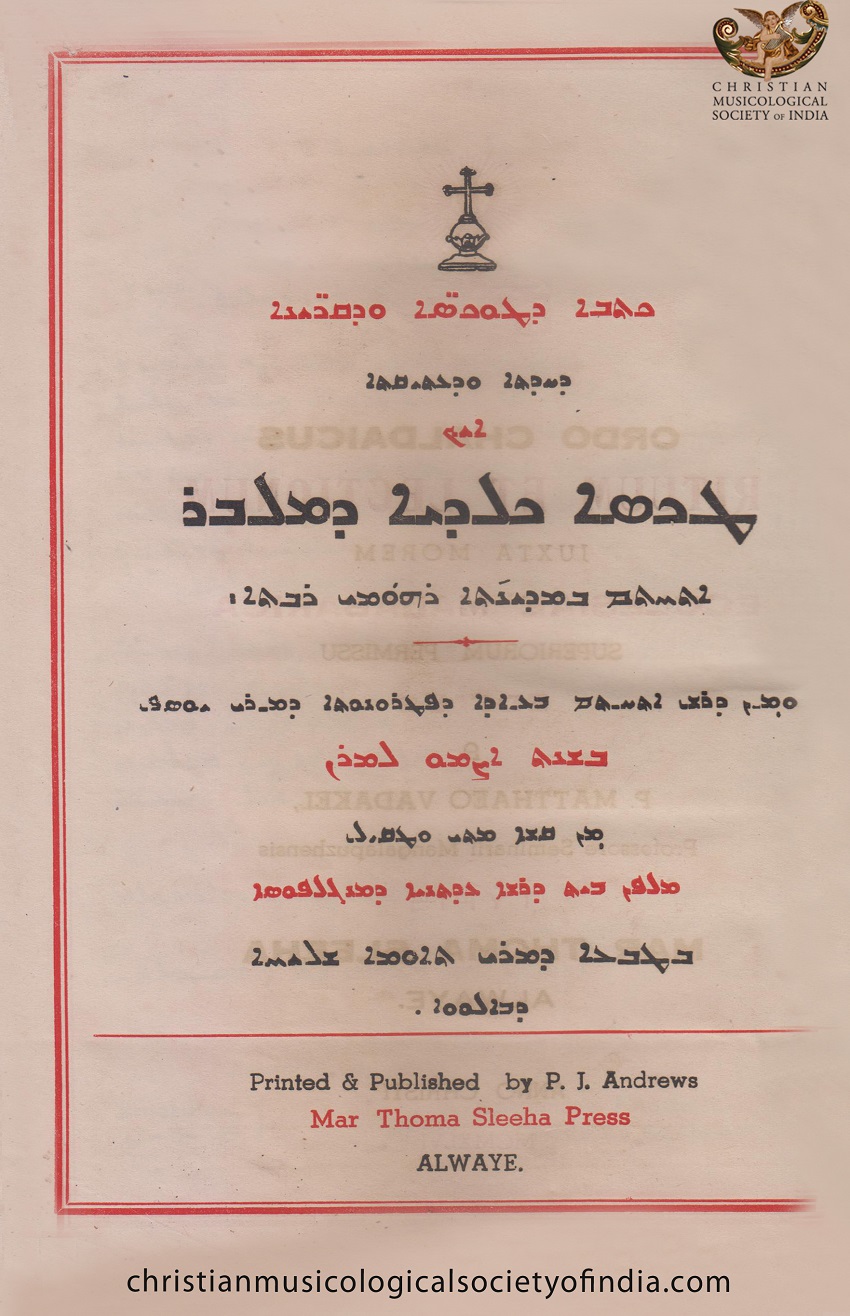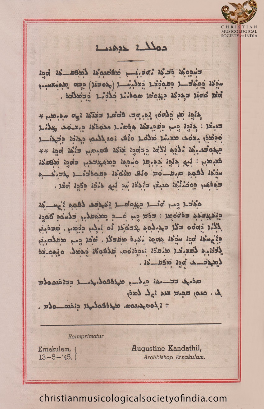 The photocopy of the Syriac text is from the 1946 Taksa that was printed at Mar Thoma Sliha Press, Alwaye, the imprimatur of Mar Augustine Kandathil, Archbishop of Ernakulam, on May 13, 1945. Mar Kandathil also wrote an Introduction in Syriac.